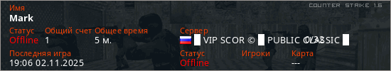 Играет на Counter Strike 1.6 сервере. Страна: РоссияПервый раз замечен 18:37 02.11.2025