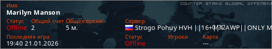 Играет на Counter Strike Global Offensive сервере. Страна: РоссияПервый раз замечен 19:32 21.01.2026
