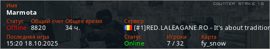 Играет на Counter Strike 1.6 сервере. Страна: РумынияПервый раз замечен 22:44 29.11.2023