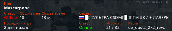 Играет на Counter Strike 1.6 сервере. Страна: РоссияПервый раз замечен 10:14 19.03.2026