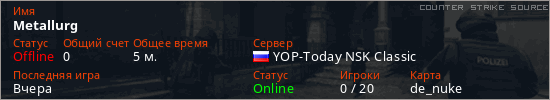 Играет на Counter Strike Source сервере. Страна: РоссияПервый раз замечен 18:38 06.04.2026