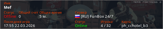 Играет на Team Fortress 2 сервере. Страна: РоссияПервый раз замечен 17:53 22.03.2026
