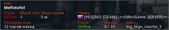Играет на Counter Strike Source сервере. Страна: РоссияПервый раз замечен 23:11 06.02.2026