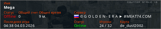 Играет на Counter Strike 1.6 сервере. Страна: РоссияПервый раз замечен 03:32 04.03.2026