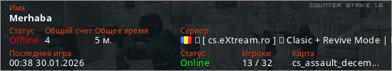 Играет на Counter Strike 1.6 сервере. Страна: РумынияПервый раз замечен 00:36 30.01.2026