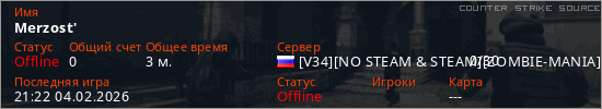 Играет на Counter Strike Source сервере. Страна: РоссияПервый раз замечен 21:22 04.02.2026