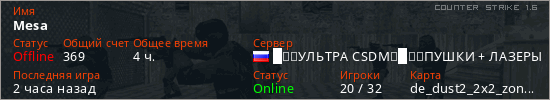 Играет на Counter Strike 1.6 сервере. Страна: РоссияПервый раз замечен 17:08 21.03.2026