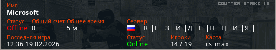 Играет на Counter Strike 1.6 сервере. Страна: РоссияПервый раз замечен 12:34 19.02.2026