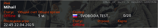 Играет на Call of Duty 4: Modern Warfare сервере. Страна: РоссияПервый раз замечен 22:43 22.04.2025