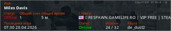 Играет на Counter Strike 1.6 сервере. Страна: СШАПервый раз замечен 07:26 20.04.2026