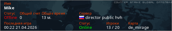 Играет на Counter Strike Global Offensive сервере. Страна: РоссияПервый раз замечен 13:20 17.04.2026