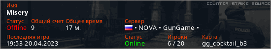 Играет на Counter Strike Source сервере. Страна: РоссияПервый раз замечен 14:35 17.04.2023