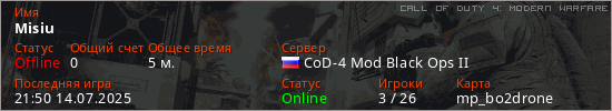 Играет на Call of Duty 4: Modern Warfare сервере. Страна: РоссияПервый раз замечен 21:42 14.07.2025