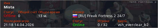 Играет на Team Fortress 2 сервере. Страна: РоссияПервый раз замечен 18:09 14.04.2026