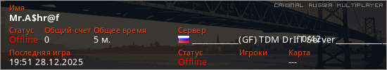 Играет на Criminal Russia Multiplayer сервере. Страна: РоссияПервый раз замечен 19:49 28.12.2025