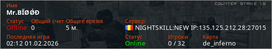 Последний раз был в сети 02:12 01.02.2026 Игрок с таким ником замечен на 8 серверах