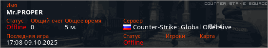 Играет на Counter Strike Source сервере. Страна: РоссияПервый раз замечен 17:06 09.10.2025