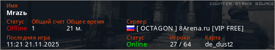 Играет на Counter Strike Source сервере. Страна: РоссияПервый раз замечен 18:39 17.11.2023