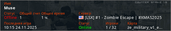 Играет на Counter Strike 1.6 сервере. Страна: СШАПервый раз замечен 09:03 24.11.2025