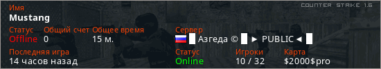 Играет на Counter Strike 1.6 сервере. Страна: РоссияПервый раз замечен 11:45 20.03.2026