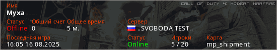 Играет на Call of Duty 4: Modern Warfare сервере. Страна: РоссияПервый раз замечен 15:45 16.08.2025