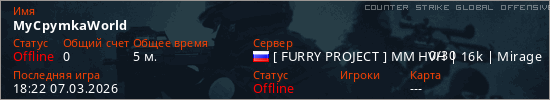 Играет на Counter Strike Global Offensive сервере. Страна: РоссияПервый раз замечен 18:17 07.03.2026