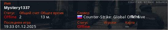 Играет на Counter Strike Source сервере. Страна: РоссияПервый раз замечен 21:28 01.11.2025