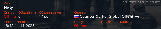 Играет на Counter Strike Source сервере. Страна: РоссияПервый раз замечен 19:32 27.09.2025