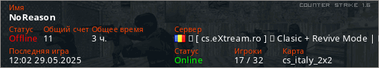 Играет на Counter Strike 1.6 сервере. Страна: РумынияПервый раз замечен 09:19 29.12.2024