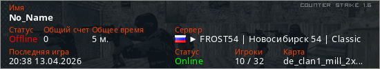 Играет на Counter Strike 1.6 сервере. Страна: РоссияПервый раз замечен 20:36 13.04.2026