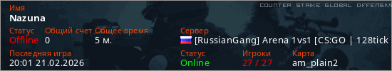 Играет на Counter Strike Global Offensive сервере. Страна: РоссияПервый раз замечен 19:57 21.02.2026