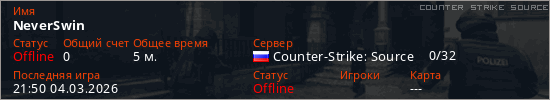Играет на Counter Strike Source сервере. Страна: РоссияПервый раз замечен 21:37 04.03.2026