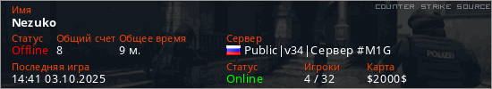 Играет на Counter Strike Source сервере. Страна: РоссияПервый раз замечен 14:22 03.10.2025