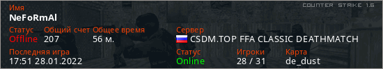 Играет на Counter Strike 1.6 сервере. Страна: РоссияПервый раз замечен 21:23 27.01.2022