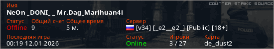 Играет на Counter Strike Source сервере. Страна: РоссияПервый раз замечен 00:04 12.01.2026