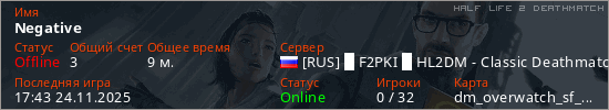 Играет на Half Life 2 DeathMatch сервере. Страна: РоссияПервый раз замечен 18:17 17.11.2025