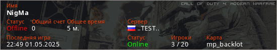 Играет на Call of Duty 4: Modern Warfare сервере. Страна: РоссияПервый раз замечен 20:30 01.05.2025