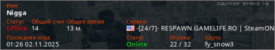 Последний раз был в сети 01:26 02.11.2025 Игрок с таким ником замечен на 35 серверах