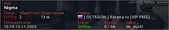 Играет на Counter Strike Source сервере. Страна: РоссияПервый раз замечен 15:31 02.11.2024