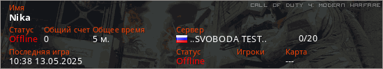 Играет на Call of Duty 4: Modern Warfare сервере. Страна: РоссияПервый раз замечен 10:32 13.05.2025