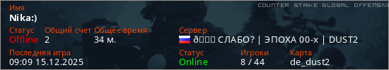 Играет на Counter Strike Global Offensive сервере. Страна: РоссияПервый раз замечен 22:24 07.09.2025