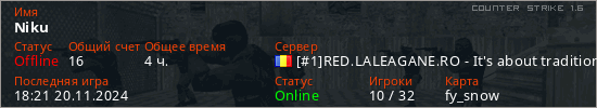Играет на Counter Strike 1.6 сервере. Страна: РумынияПервый раз замечен 22:32 28.06.2022