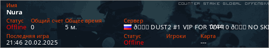 Играет на Counter Strike Global Offensive сервере. Страна: РоссияПервый раз замечен 21:20 20.02.2025