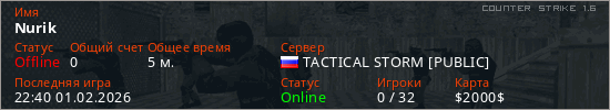 Играет на Counter Strike 1.6 сервере. Страна: РоссияПервый раз замечен 22:38 01.02.2026