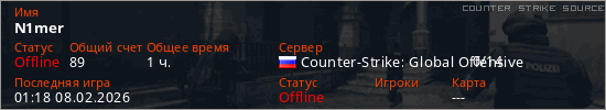 Играет на Counter Strike Source сервере. Страна: РоссияПервый раз замечен 15:20 05.09.2025