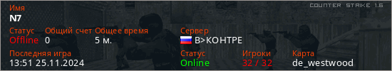 Играет на Counter Strike 1.6 сервере. Страна: РоссияПервый раз замечен 13:46 25.11.2024