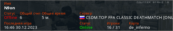 Играет на Counter Strike 1.6 сервере. Страна: РоссияПервый раз замечен 16:42 30.12.2023