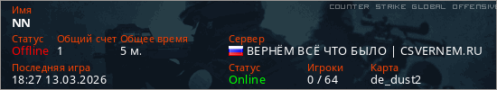 Играет на Counter Strike Global Offensive сервере. Страна: РоссияПервый раз замечен 18:17 13.03.2026
