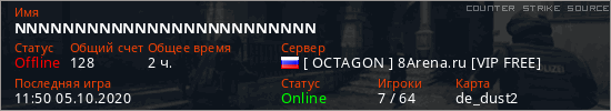Играет на Counter Strike Source сервере. Страна: РоссияПервый раз замечен 09:53 05.10.2020