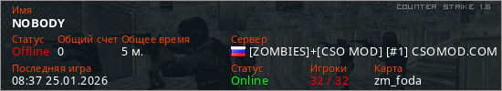 Играет на Counter Strike 1.6 сервере. Страна: РоссияПервый раз замечен 08:35 25.01.2026